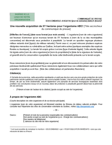 Gabarit de communiqué de presse pour l’annonce de l’acquisition d’un milieu naturel, incluant en deuxième page le « Pourquoi, quand et comment » d’un communiqué de presse